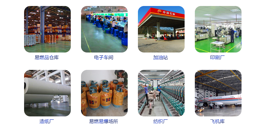 輕工業(yè)廠房、機械摩擦車間、電子精密儀器儀表車間、油品制造及儲蓄庫、氣體制造車間、高壓變電間、倉庫物流、易燃貨物堆放區(qū)、實驗室